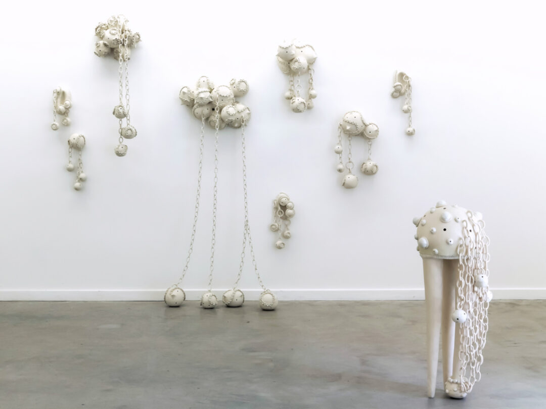 Dans l’exposition « Parure » Frédérique Fleury  déploie un univers à la fois ornemental et subversif où les matériaux dialoguent avec les symboles : chaînes de céramique, textiles rembourrés, porcelaines piquetées ou sculptées deviennent autant de corps ambigus, entravés et séduisants qui évoquent tour à tour la contrainte sociale, les codes genrés, les rituels de beauté ou les jeux de pouvoir.