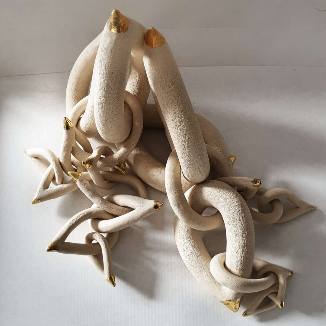 Dans Étreinte 2 les chaînes de grès brut semblent s’élever dans un mouvement vertical, leurs extrémités dorées capturant la lumière comme des étoiles.