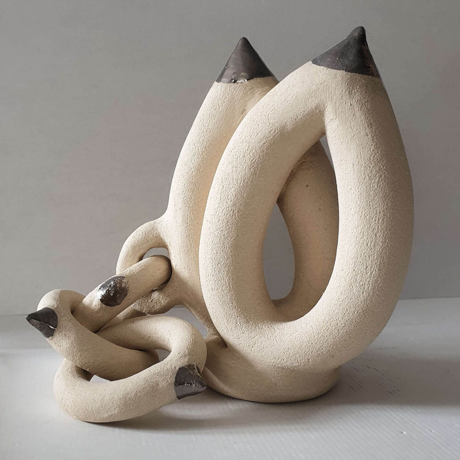 Avec Étreinte 3 Frédérique Fleury donne forme à un contraste silencieux où les anneaux de grès brut et les pointes de platine semblent s’épauler et se confronter.