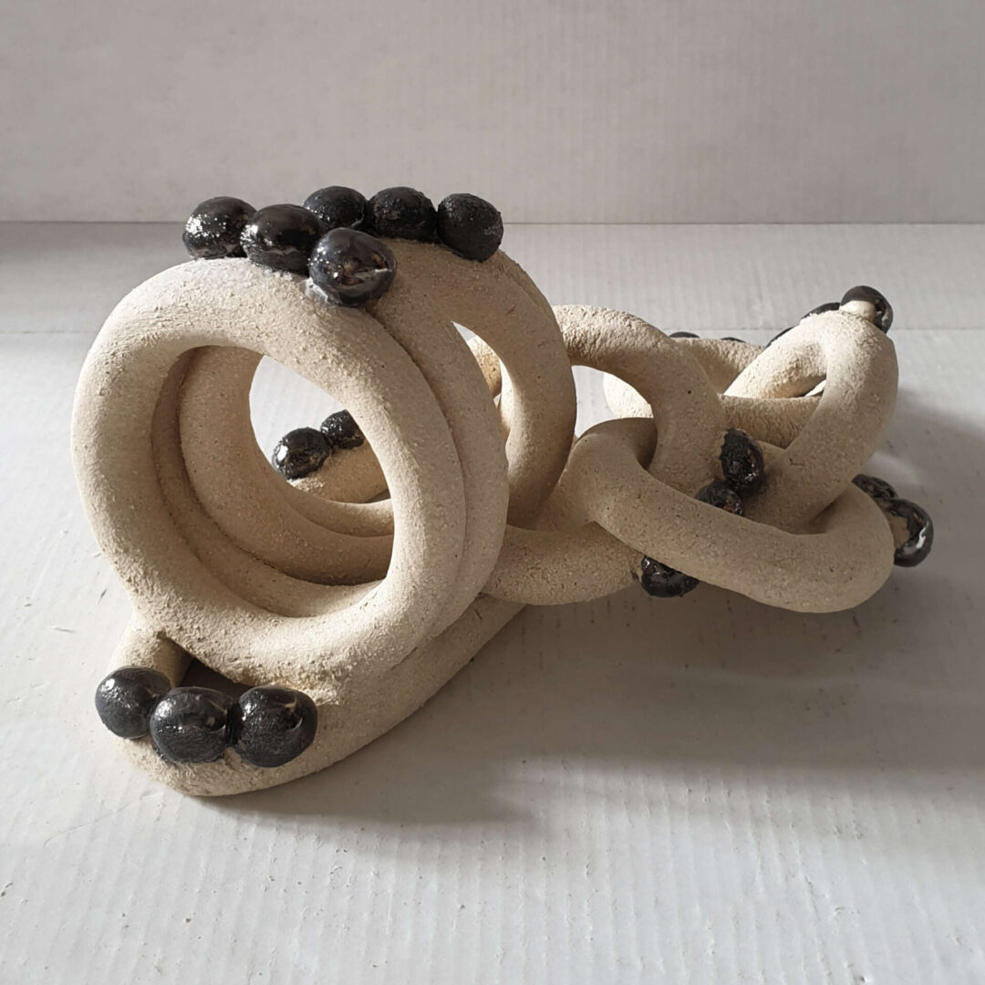 Étreinte 7 explore l’interaction entre la solidité de la matière et l’éclat mystérieux des perles métalliques. Frédérique Fleury sculpte ici une symphonie d’entrelacs où la rudesse du grès brut dialogue avec la brillance sombre des émaux.